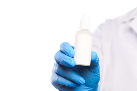 Photo of a medicine in drops in the white plastic bottle located separately on a white background
