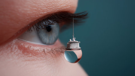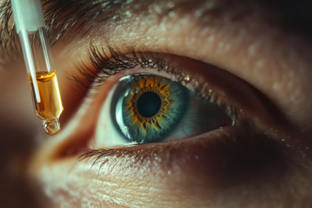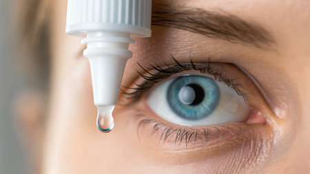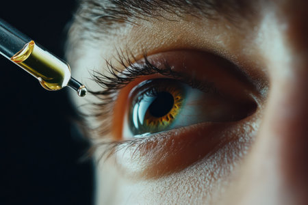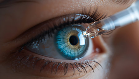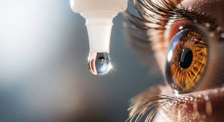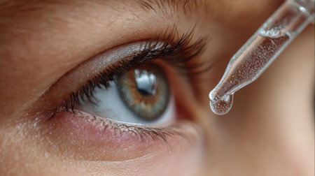 Close-up of a single drop of eye drops about to fall into a hazel eye. The image highlights the eye's intricate details and the clarity of the liquid. Perfect for medical, healthcare, or