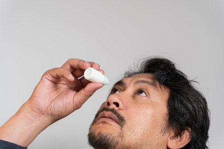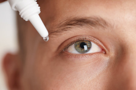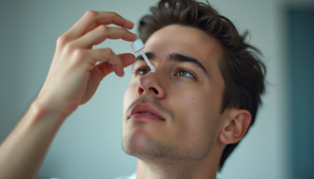 A young man with tousled hair is gently applying eye drops, showcasing a moment of self-care and attention to health. His expression reflects concentration and determination, emphasizing the importance of eye health in daily routines.