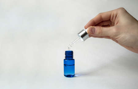 Blue glass bottle with pipette dispenser on white background. Collagen, anti-aging skin care products. Hand holds a pipette. Space for text.