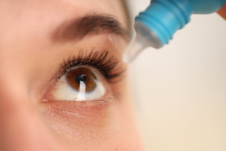 Asian woman use eye drop or artificial tears by drops in to the eye for inflammation or dryness problem therapy of eyeball for eyes health