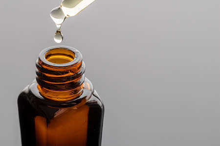 A drop of essential oil falling into a brown bottle on a gray background, with copy space