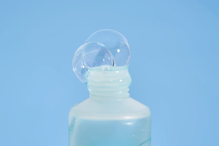 Shampoo pouring out of a small tube on a blue background. Texture.