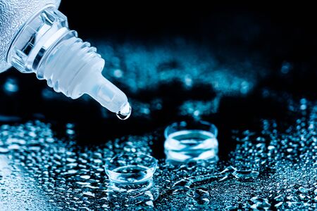 Man drops eye drops install lenses, moisturizing. Preservation and solution vision problems. Eye diseases are recognized. Drops before putting on lenses or before removing at end day