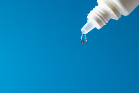 The image features a hand holding a white eye drop bottle against a white background. The hand is positioned with fingers gently gripping the bottle, which has a dropper tip. The image is clear and SEO-friendly, highlighting the eye drop bottle as the focal point.