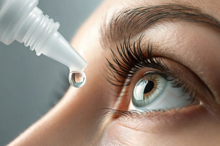 Moist eye drop close up eye blue iris contact lens solution tear application eyelash detail human eye brown skin