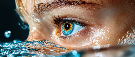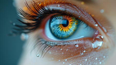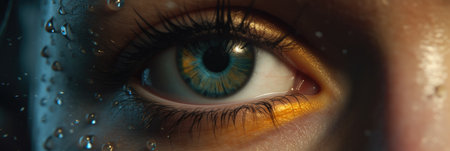 Mesmerizing closeup showing a human eye with water droplets, intricate details, a blue and green iris, featuring an intense gaze concept