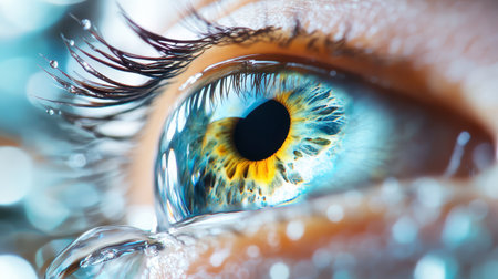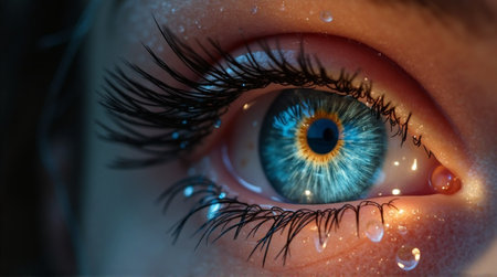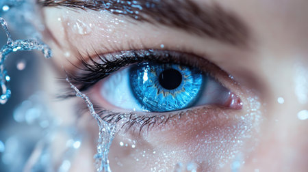 Stunning close-up of a captivating blue eye with delicate water droplets and shimmering light
