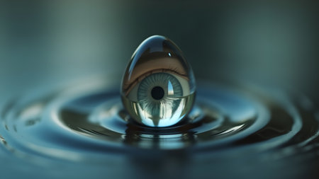 Captivating image showcasing a human eye reflected in a water droplet. The droplet rests upon the water surface, creating ripples and amplifying the detail of the eye. A fusion of art, science, and natural beauty.