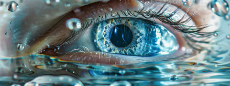 A detailed close-up of a blue human eye partially submerged in water, with reflections and droplets creating a surreal and artistic effect.