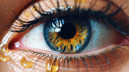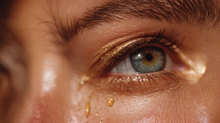 This captivating close-up image showcases a human eye with striking colors and golden makeup highlights, evoking deep emotion and beauty.