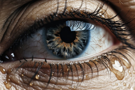 Profound emotional landscape of sadness and grief through a close-up portrayal of a tearful eye, captures the raw intensity of human emotions, inviting contemplation and empathy. Generative AI