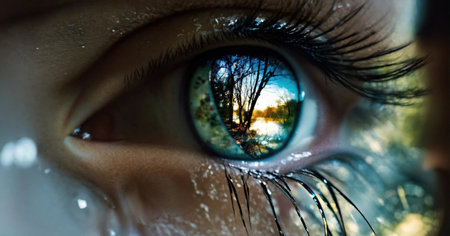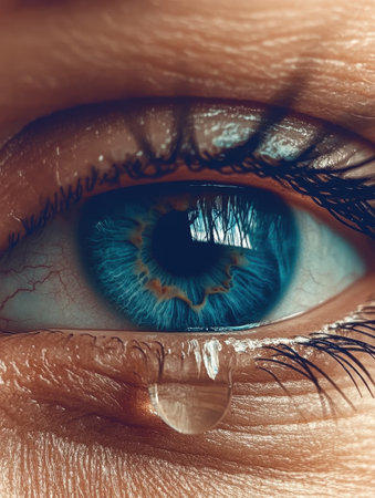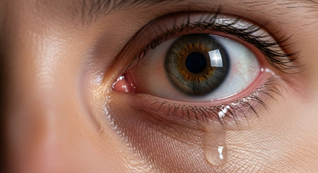 A close view of a single eye showcases a tear rolling softly down the cheek, capturing profound emotion. The detailed textures of the skin and eyelashes enhance the natural lighting and realism.