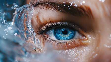 This captivating close-up photo showcases a striking blue eye surrounded by dynamic water splashes, creating an enchanting and serene atmosphere.