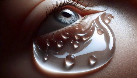 Close-up of an eye with an eyedropper applying a liquid drop. High-detail macro shot focusing on the texture of eyelashes and the clarity of the drop. Ideal for ophthalmology, healthcare, or beauty.