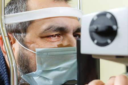 Caucasian aged male looking at slit lamp machine during medical check up in eye clime