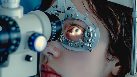 A close-up view of a persons eye during a detailed optometry examination, showcasing the equipment used to evaluate vision and ocular health