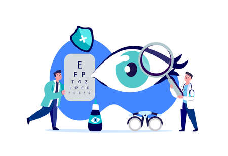 Doctors Ophthalmologist, Oculists Examine, Diagnose Eye Vision Acuity. Farsightedness, Color Blindness, Glaucoma, Corneal Dystrophy Treatment.Research Clinical Investigation.Medical Council Illustration
