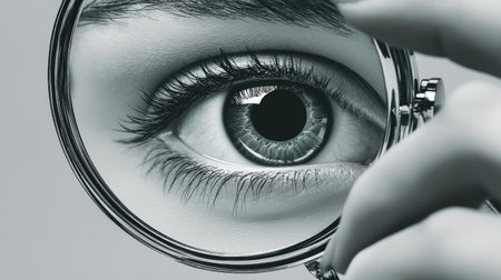 Doctor ophthalmologist looks through magnifying glass in ophthalmological clinic
