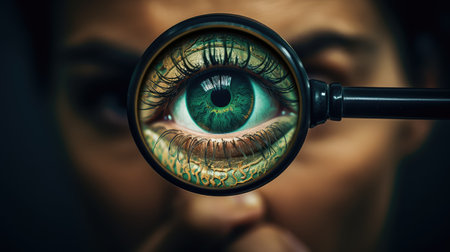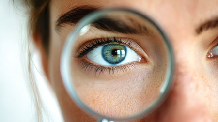 A young girl is looking through a big magnifier closeup