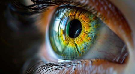 A detailed close-up of a human eye featuring a striking, multicolored iris with shades of green, orange, and yellow. eyelashes frame the vibrant iris, while intricate textures and reflections highlight the eyes complexity and beauty.