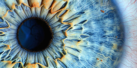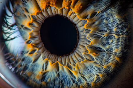 a close-up of an eye's iris, highlighting the complex fibrous structures and the gradations of color radiating from the pupil