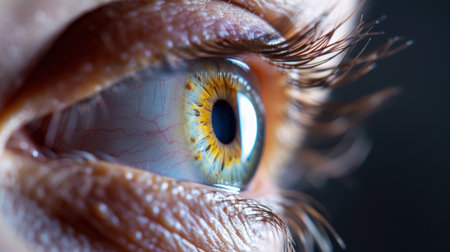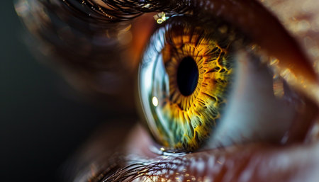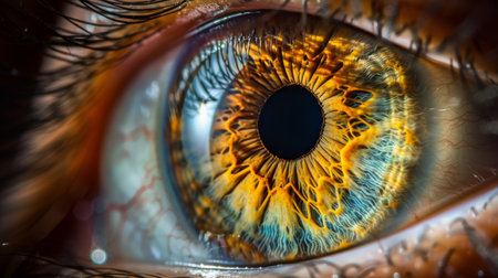 Extreme close up of an open hazel eye showcasing the intricate details of the iris, pupil, and surrounding blood vessels, emphasizing the complexity and beauty of human vision