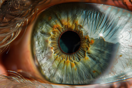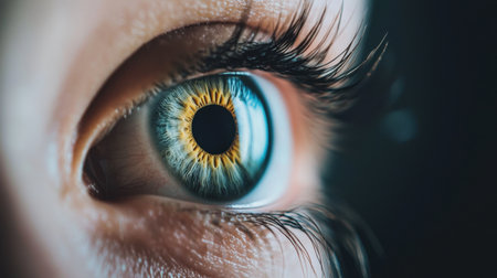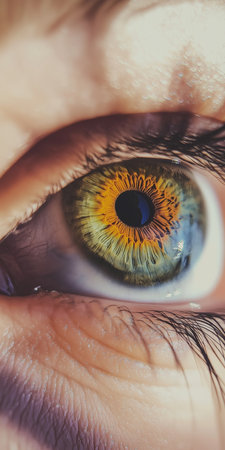 Detailed close-up of a human eye, featuring vibrant iris colors, a dark pupil, and delicate eyelashes, emphasizing the intricacies of human anatomy and vision
