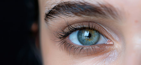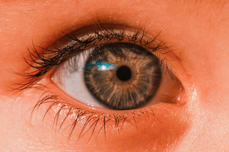 Cropped photo of beautiful macro photo of human eye, iris, pupil, eye lashes, eyelids