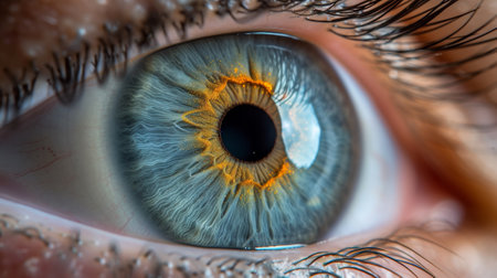 Intricate details of a vibrant human eye, showcasing blue and yellow pigmentation with reflections on the cornea. fine eyelashes frame the eye, highlighting the texture and vivid coloration of the iris and the clarity of the gaze.