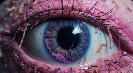 Detailed, close-up of a human eye with purple and blue iris, lashes and surrounding skin
