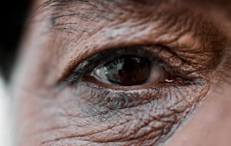 Close up of a senior womans blue eye, highlighting the wrinkles and texture of aging skin around the eyelid, capturing the essence of time and experience