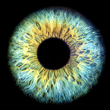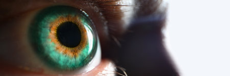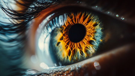 Detailed close-up of a human eye, featuring vibrant iris colors, a dark pupil, and delicate eyelashes, emphasizing the intricacies of human anatomy and vision