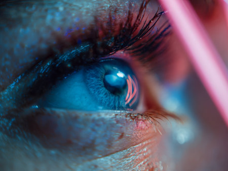 A vivid depiction of a gaze intensified by luminous blue and pink hues, showing the complex patterns of the iris, delicate eyelashes, and subtle skin nuances.