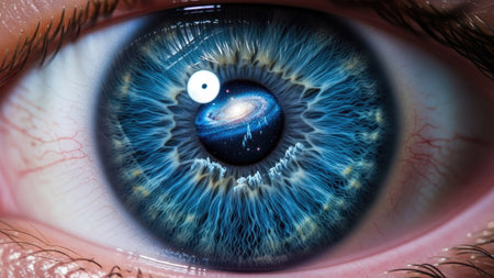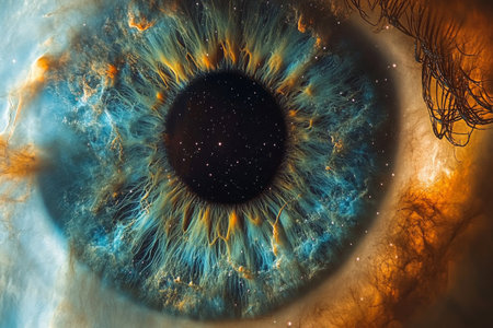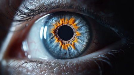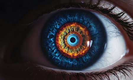 Detailed close-up of a human eye, featuring vibrant iris colors, a dark pupil, and delicate eyelashes, emphasizing the intricacies of human anatomy and vision
