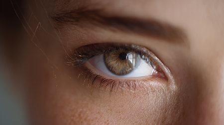 Macro photo close-up of female brown eyes. Middle-aged European, clear skin, thick eyebrows, wrinkles around the eyes.