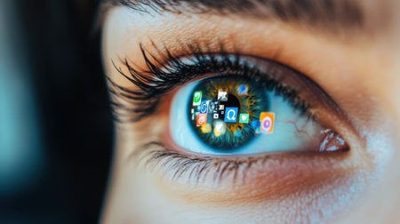 This close-up image showcases a human eye with vibrant digital icons reflected in it, representing the fusion of technology and personal connectivity in contemporary society.