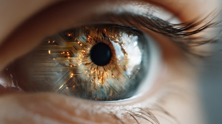 This captivating close-up of a human eye showcases intricate digital circuits and glowing elements that symbolize the fusion of technology and human vision.