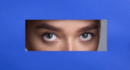 Beautiful Female Eyes in Blue Paper Frame Looking at Camera