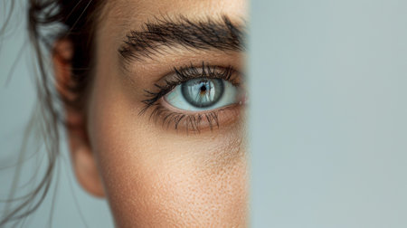 Captivating close-up of a human eye featuring a stunning blue iris, long lashes, and a natural brow, illuminated by soft light that enhances the intricate details of the eye and its expression.