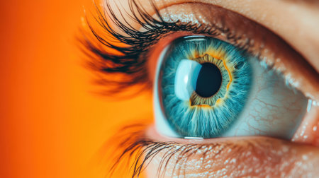 This close up showcases a striking human eye with blue and orange hues highlighting the intricacies and details of the iris and eyelashes.