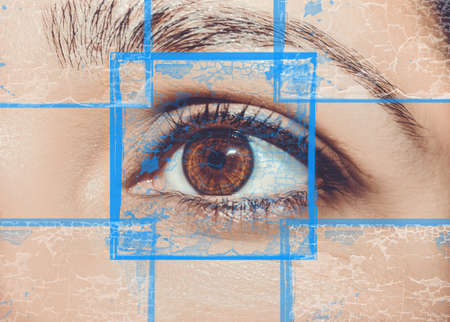 Close-up of a human eye with a glowing digital biometric scanning interface, futuristic technology concept.