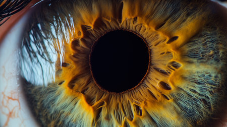 Extreme close up view of a womans eye with a vibrant yellow and orange iris, showing intricate detail
