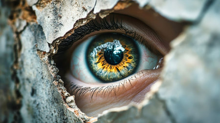 A human eye peers through a rough opening in a wall, revealing vibrant colors and textures, capturing an intense moment of observation and curiosity.