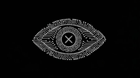 Inside showing white circuit board eye symbol with x inside on black background representing surveillance and technology. resolution