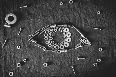 Closeup of black eye graffiti street art on textured wall in Athens, Greece.
