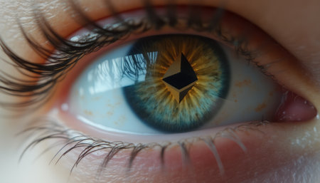 A close-up of a human eye with a Etherium symbol reflected in the iris, symbolizing environmental awareness and sustainability. The image is detailed and sharp.