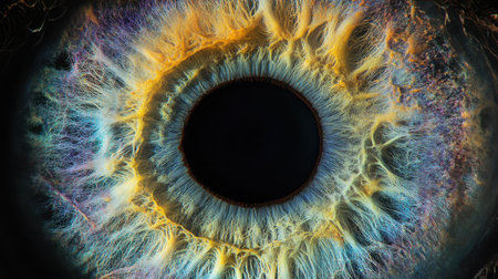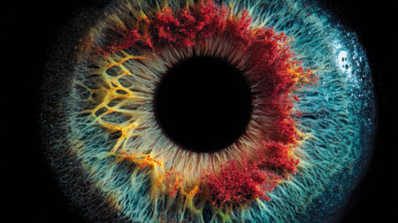 An intricate close up of a human eye showcases vibrant colors and detailed patterns in the iris revealing the stunning complexity of human anatomy.