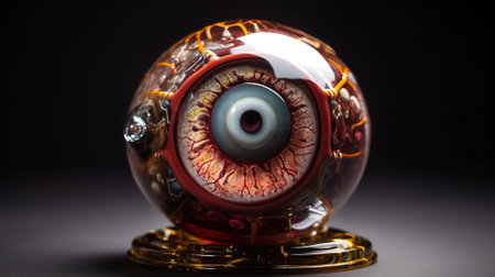 A creepy artificial eye wrapped in roots and vines, creating a chilling and eerie atmosphere.