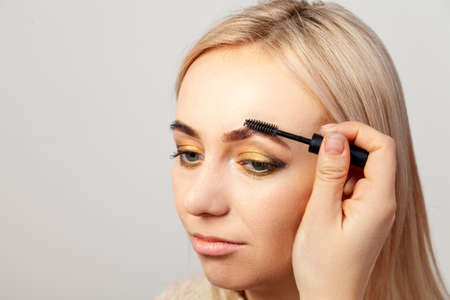 Eyebrow shaping of a model in a beauty studio on a white background, the wizard using a brush paints the hair of the eyebrows of a blonde girl with blue eyes and makeup in oriental style.
